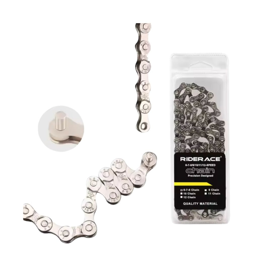 Découvrez la chaîne de vélo "Ride Race" 8 vitesses, conçue pour booster vos performances ! Sa structure double X renforce la résistance à l’attraction et à la torsion, garantissant des changements de vitesse rapides et fluides. Avec son éclat argenté et son traitement antirouille, elle allie style et durabilité pour vous accompagner dans toutes vos aventures à vélo. Prêt à dominer la route ?